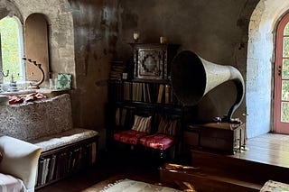 My hostess wound the handle on the antique gramophone.